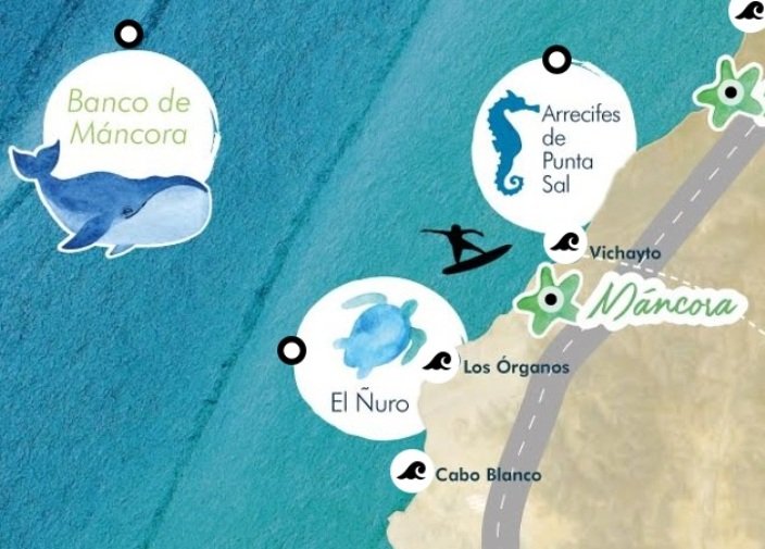 Ubicada al extremo norte del departamento de Piura, Máncora es uno de los balnearios más conocidos del Perú. Cuenta con sol todo el año, tiene playas de arena blanca, olas perfectas y una deliciosa gastronomía. Esta es un lugar codiciado por los surfistas, en especial de noviembre a enero, cuando se forman las mejores olas.